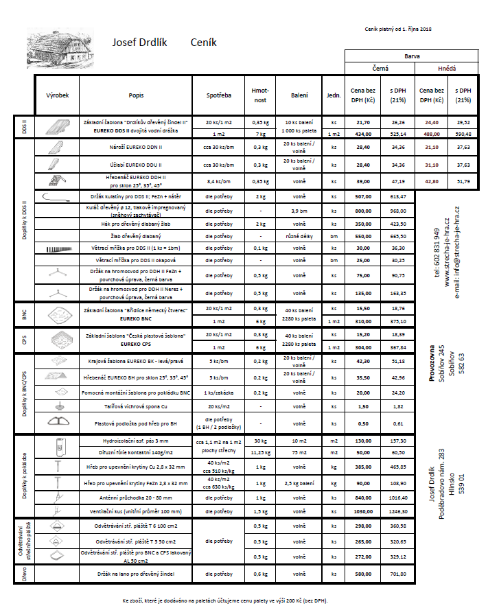 Základní šablona "Drdlíkův dřevěný šindel II" EUREKO DDS II dvojitá vodní drážka 20 ks/ 1 m2 0,35 kg 10 ks balení 800 ks paleta ks 21,70 24,40